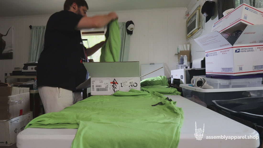 The only thing we outsource is the blank apparel — all designing, printing, pressing, packing, and shipping happens right here in our home shop in Twin Lakes, WI. Since everything stays under our roof, it's easy for us to maintain hands-on quality control at every step and make sure every piece meets our standards before it goes out the door.