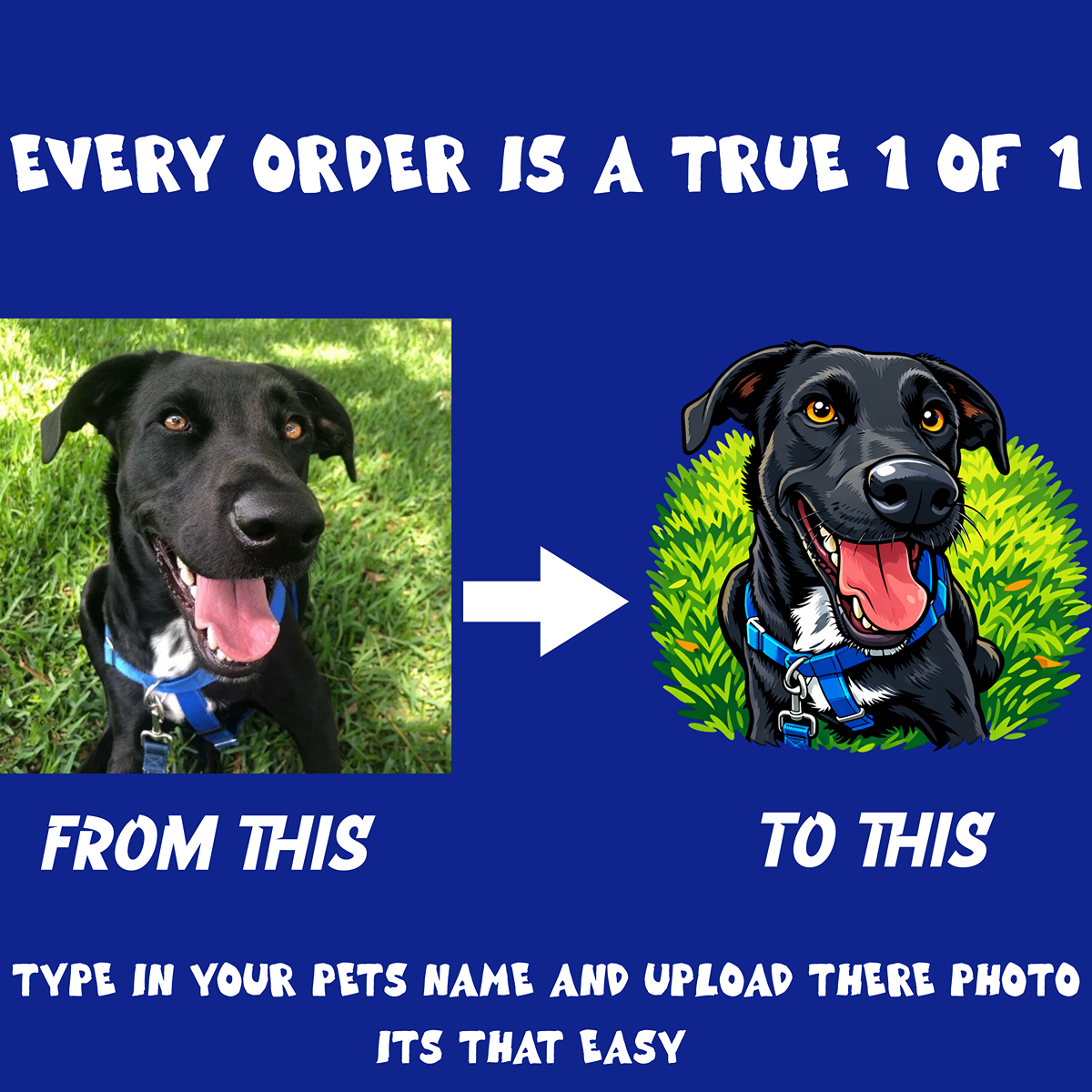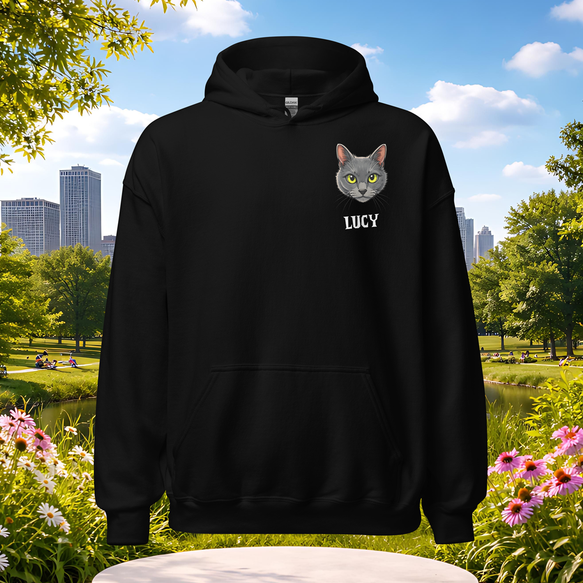 The One-of-One Pet Series Hoodie is custom-made using up to three photos of your pets and their names, submitted by you at checkout. After you upload your photos and enter each pet’s name, our team transforms them into custom cartoon-style designs made specifically for apparel. The final artwork is then printed exclusively for you — once and never again.